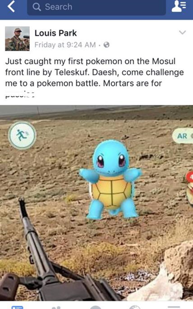 «Лишь что поймал своего первого покемона на мосульской линии фронта возле Телескуфа. ИГИЛ, потребуй меня на битву покемонов. Пушки для слабаков», — подписал он снимку.